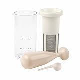 • El set está formado por un recipiente transparente en el que encaja perfectamente el filtro (elaborado con una malla de acero de 300 micras y de construcción cónica para que el agua entre y salga y se genere un flujo constante que crea una perfecta emulsión del extracto de los ingredientes), un mortero de plástico y una cuchara dosificadora. También lleva unas fichas con 5 recetas.