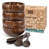 - 🌿 PRODUCTO VEGANO Y SIN DESPERDICIOS: Nuestro juego de tazones de coco natural, está certificado como apto para alimentos de acuerdo con las leyes del Reino Unido y la UE y está pulido con aceite de coco virgen natural para aumentar su durabilidad. Incluimos 2 tazones de coco hechos a mano y cucharas de madera de ébano, una pajita de bambú, una bolsa de arpillera y un cepillo de limpieza. Cada tazón es escogido a mano de los cocos más gruesos y de la más alta calidad.