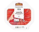 - El jamón serrano tiene un aroma agradable y un sabor delicado.Equilibrado en sal. De color rosa a rojo púrpura en la parte magra y aspecto brillante de la grasa.